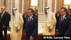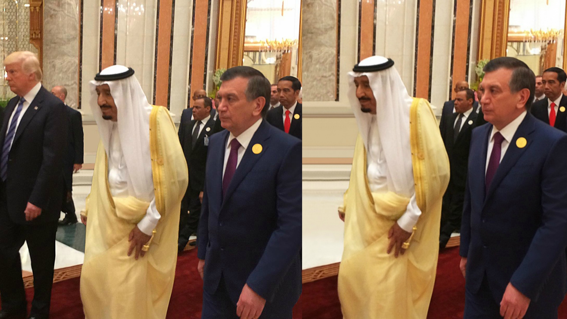В другой 59-летний Мирзиёев идет рядом с Королем Саудовской Аравии Салманом бин Абдулазизом Ол Саудом. Справа – вариант УзА, слева – оригинал.