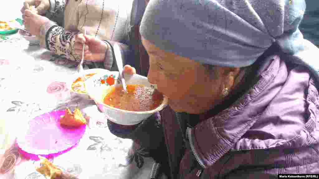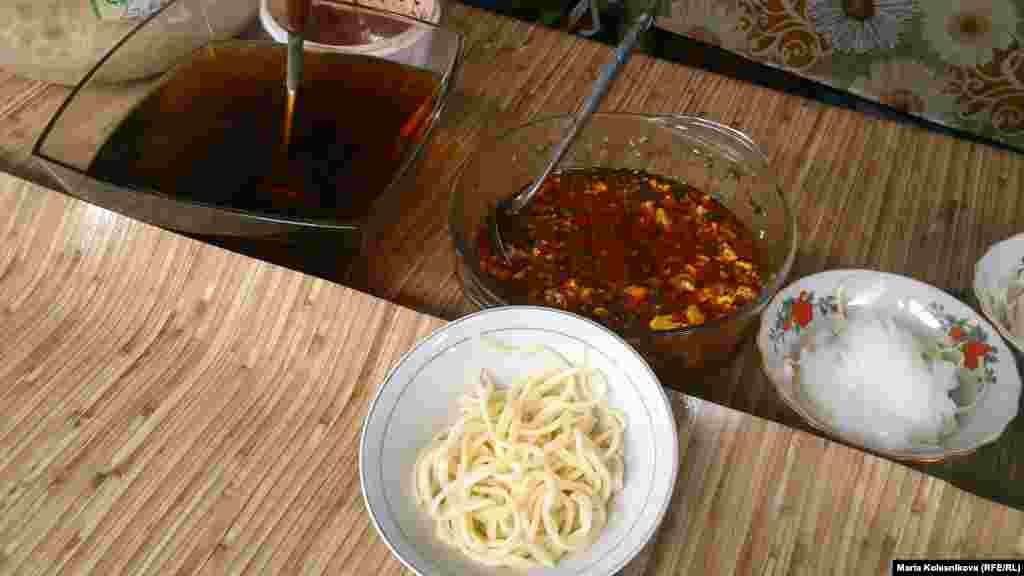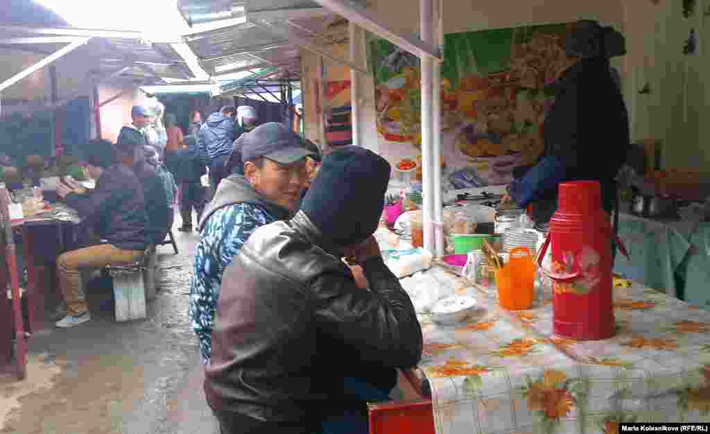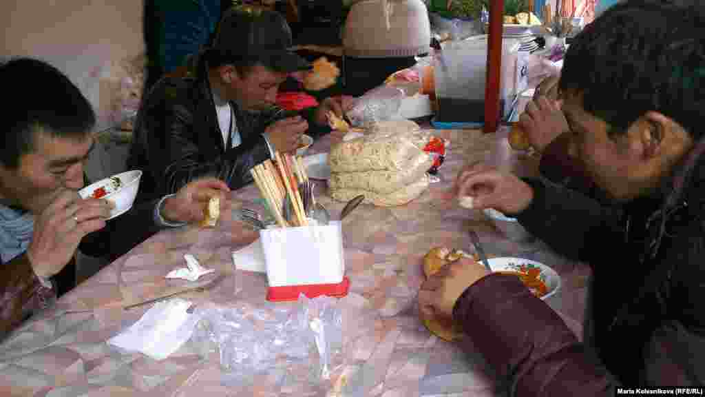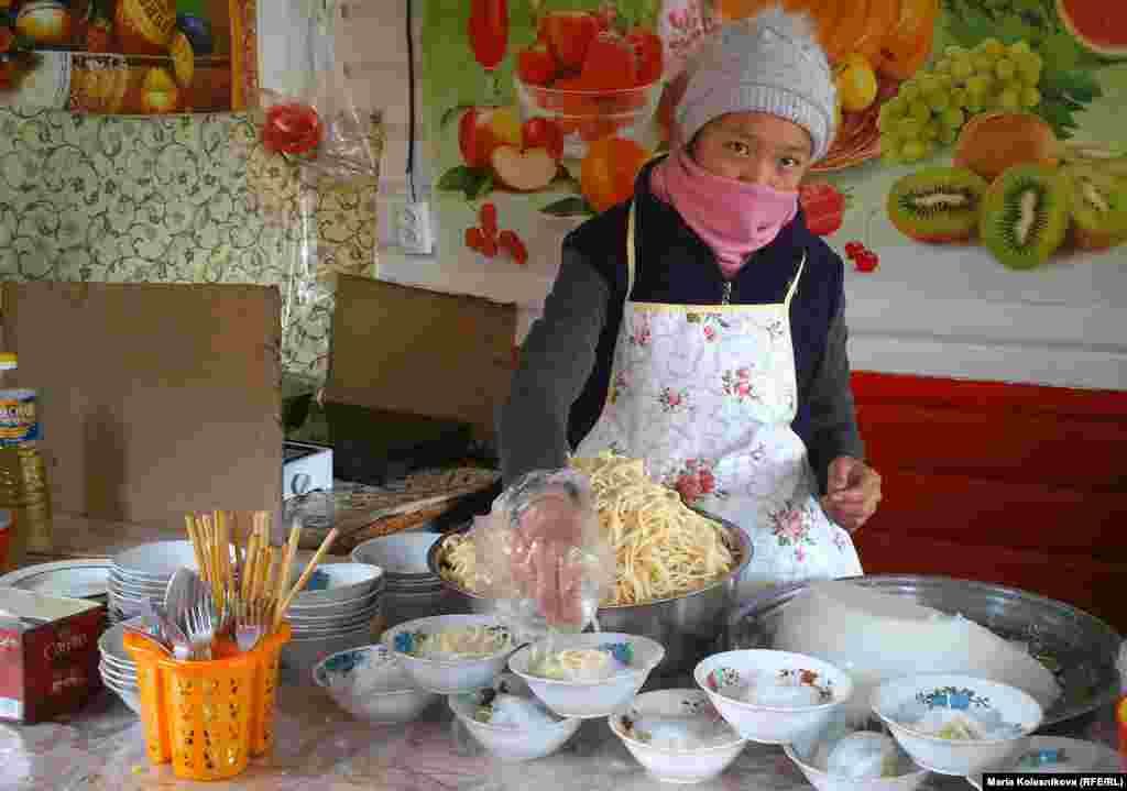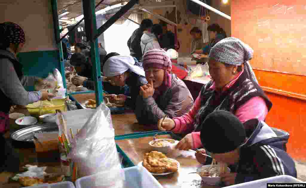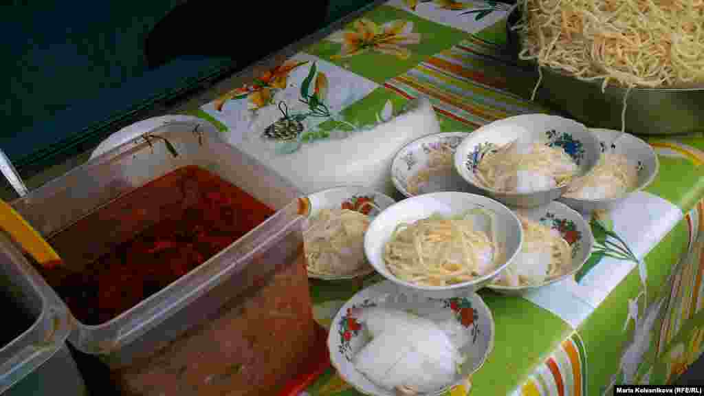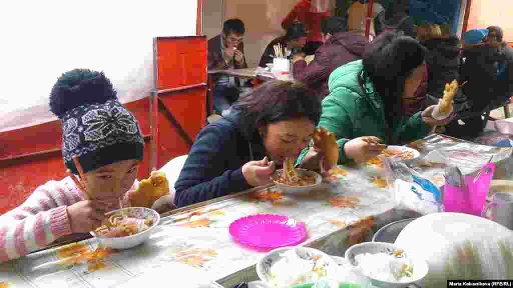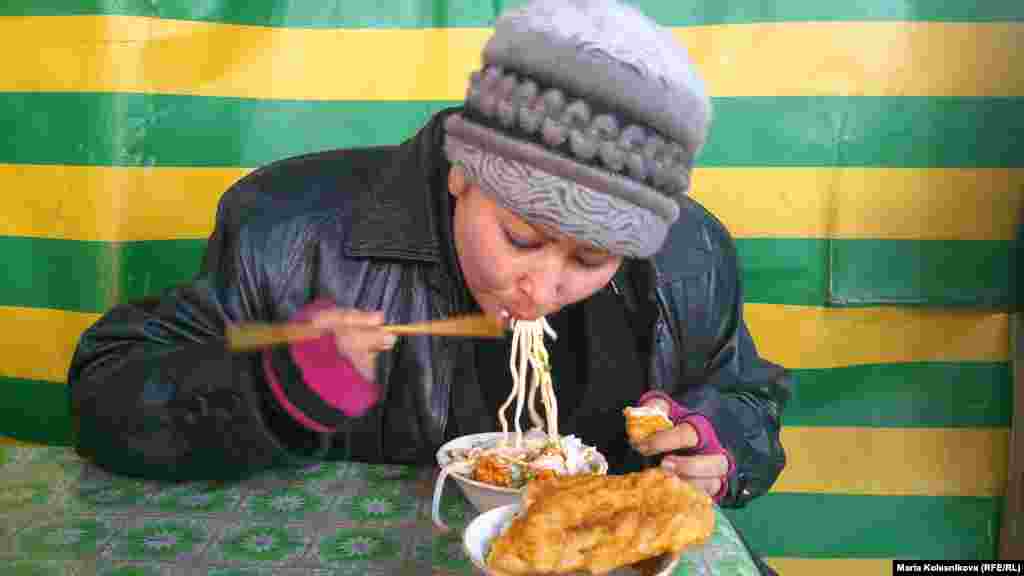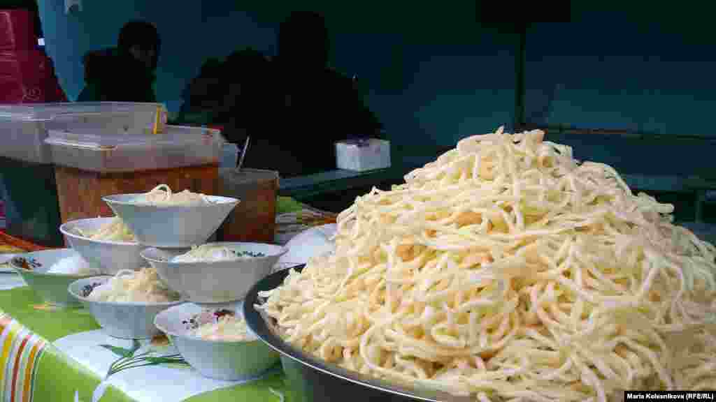В самом центре каракольского базара "Ак-Тилек" расположены два ряда торговцев популярным блюдом дунганской кухни "аш-лянфу". Это холодное, острое блюдо с крахмалом и тестом давно стало визитной карточкой Каракола. "Азаттык", Кыргызская служба РСЕ/РС